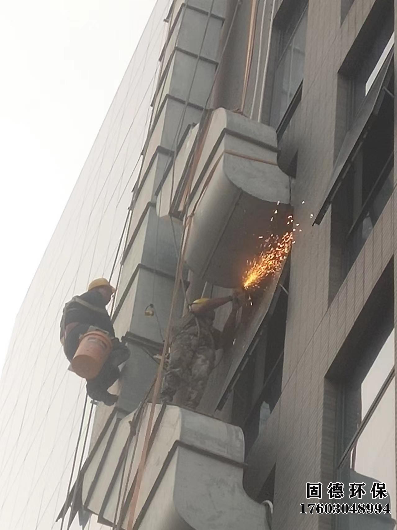 我們的蜘蛛人在外墻施工,施工難度特別大,要求不能有一顆螺絲釘?shù)粝聛怼R驗(yàn)榈粝聛砭蜁覊南旅娴牟AВ?br/>