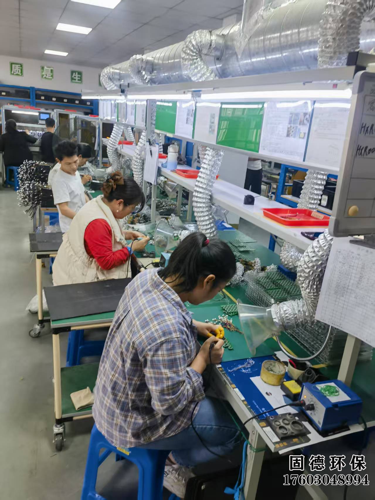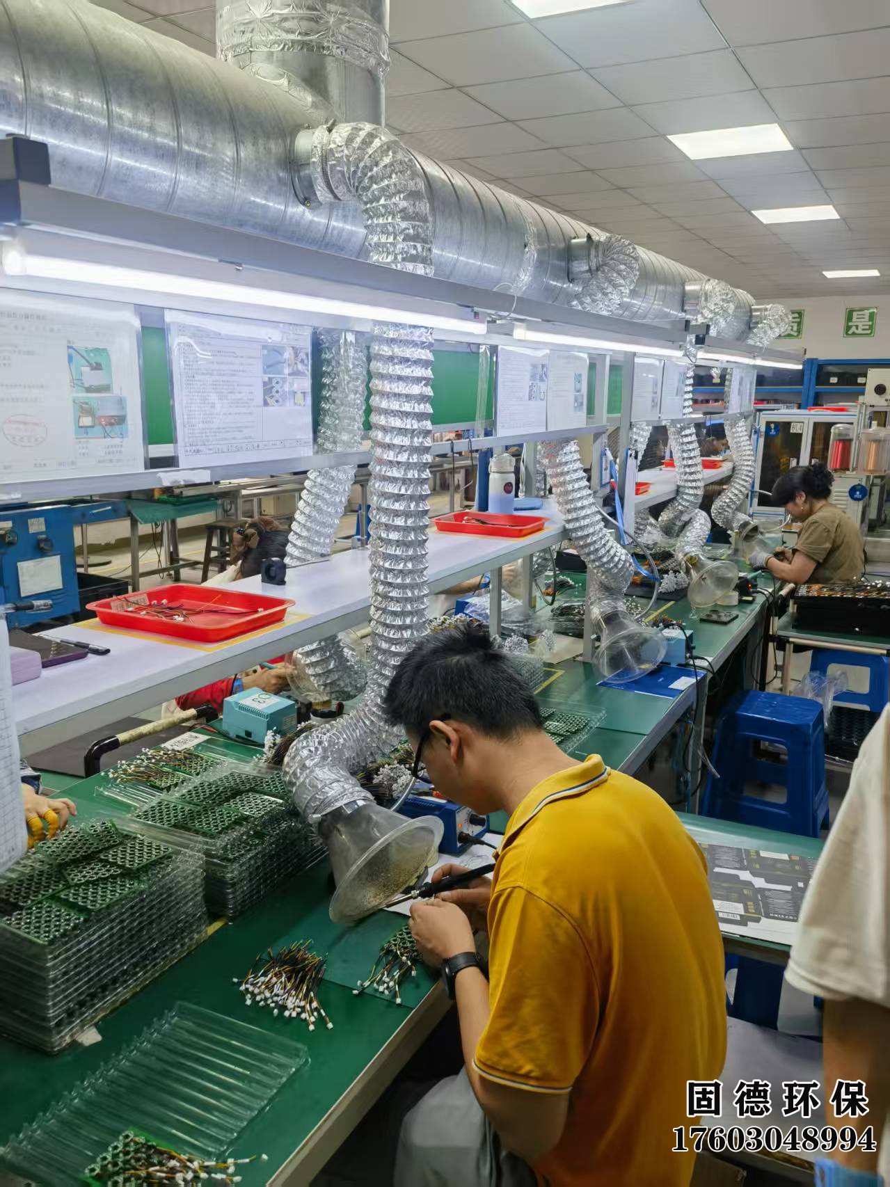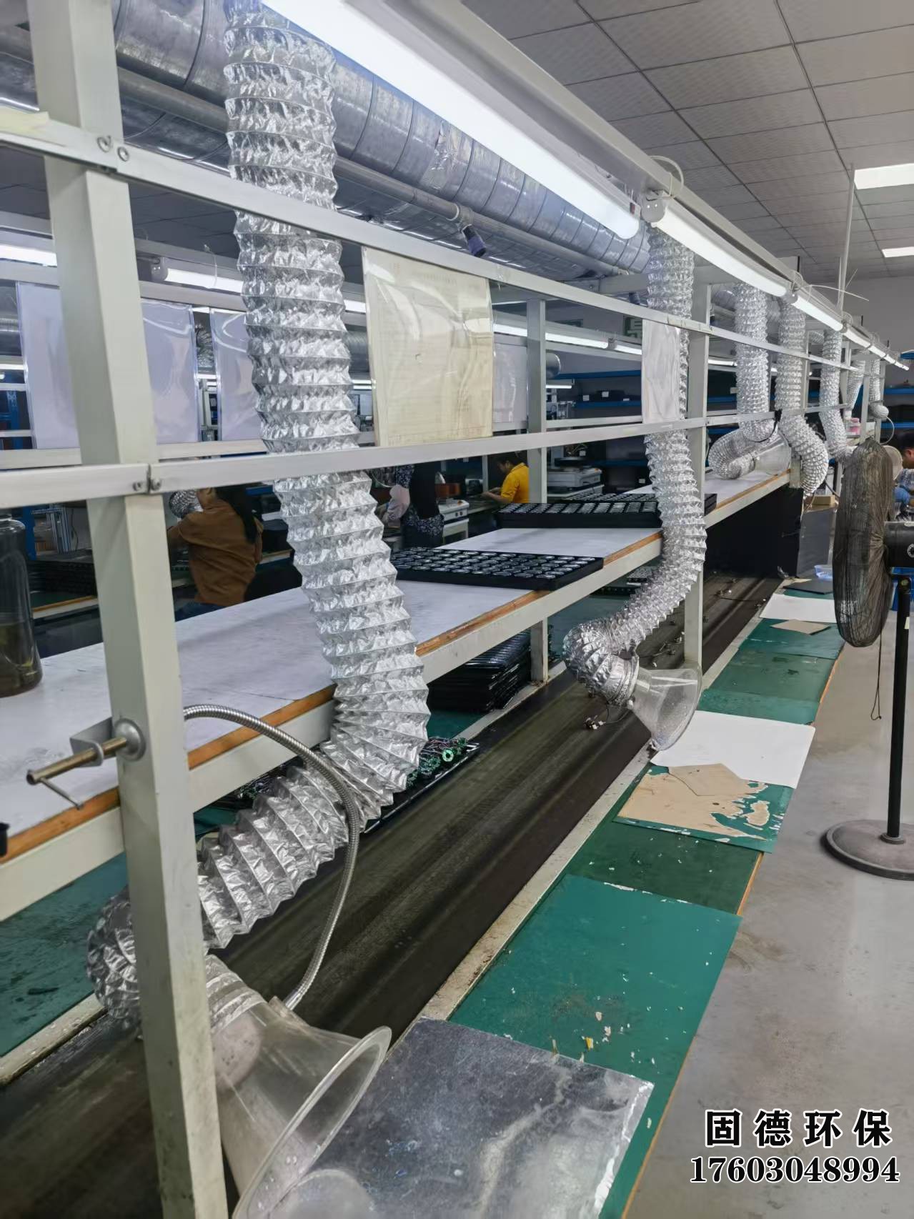 在深圳市固德通風環(huán)保工程有限公司的幫助下,您的生產線也能擁有如此整潔、有序的工作環(huán)境。圖中,我們的客戶生產線正高效運轉,工人們專注地操作著每一道工序。我們定制的柔性通風導管懸掛于生產線之上,有效吸走生產中的煙霧與灰塵,確保空氣流通,為工人創(chuàng)造了一個健康、舒適的工作環(huán)境。